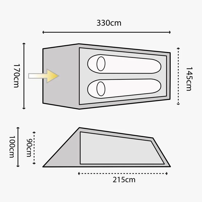 - Dimensions Outer: 330cm x 170cm x 100cm Inner: 215cm x 145cm x 90cm Pole width:6.9mm